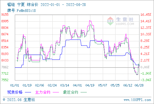 锰硅方面:2022上半年硅锰涨跌均有,但整体呈上涨趋势。1月份临近年关由于各大钢厂招标进行,带动市场气氛活跃,价格开始上涨,3月中旬原料双炭价格攀升,硅锰现货市场跟风上涨,现货价格报价在8400-8600元/吨左右,但是由于上海公共卫生关系事件影响,下游钢铁市场的需求不佳,价格上涨受阻,5月份硅锰期货市场受到黑色系走弱,现货市场再次受到重创,价格较大幅度下降,市场情绪悲观,目前关注点在钢招上。根据生意社价格监测,宁夏地区报价(规格为FeMN68Si18)6月29日出厂区间价格在7900元/吨(含税),较1月涨0.86%。
