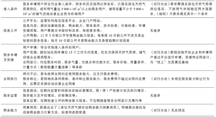 江苏省的LNG接收站公平开放工作走在前列。早在2015年,国家能源局江苏监管办公室(简称江苏能监办)牵头发布了苏监能行业〔2015〕162号《江苏省LNG接收站公平开放监管实施办法(试行)》(简称《试行办法》)。为进一步落实发改能源规〔2019〕916号《油气管网设施公平开放监管办法》要求,2021年2月江苏能监办会同江苏省发展和改革委员会(简称江苏省发展改革委)制定发布了《江苏省液化天然气接收站公平开放监管实施细则》(简称《细则》)[6],同时配套制定了《液化天然气接收站剩余能力测算规范》。《细则》对LNG接收站运营企业和用户在准入条件、信息公开、服务申请与受理、合同执行等方面提出了更加具体明确的要求。特别地,《细则》单独设立一章对用户准入条件做了详细规定,核心内容除常规要求的行业许可、安全资质、财务和资信条件外,量化提出:拥有液化天然气资源或者年用气量(销售量)不少于5 000×104 m3的独立法人企业或其授权分公司均可提出使用申请,储存容量在5 000×104 m3及以上的储气设施运营企业视为终端用户。《细则》关键性条款及与《试行办法》的差异详见表1。
