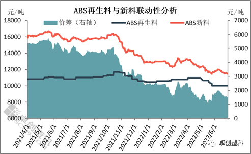从上图可以看出,4月至5月底,新料ABS呈现持续下跌的走势,且跌幅较大。至5月25日,新料ABS主流价格为12400-13600元/吨,较二季度初价格下跌1825元/吨。5月底新料价格逐渐止跌回涨,但至6月中旬,新料价格结束上涨走势,又开始下跌。整体来看,新料价格下行为主,对再生料起到作用利空大于利好。