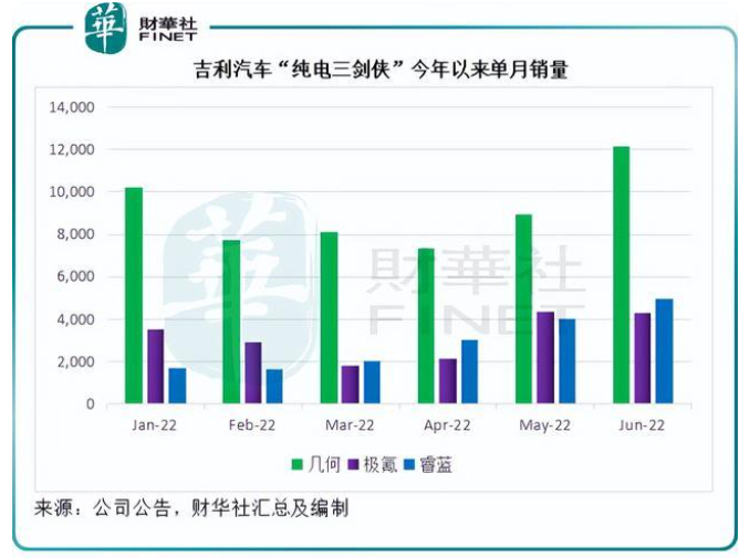 从以上吉利汽车的销售数据可以看出,在新能源汽车中,其纯电动车的销量绝对增幅十分显著,而且在新能源车中的占比也最大,主要来自其“纯电三剑侠”几何、极氪和睿蓝,单月销量分别为12,163部、4,302部和4,936部,其中极氪和睿蓝分别于2021年10月和2022年1月才开始首发新车。