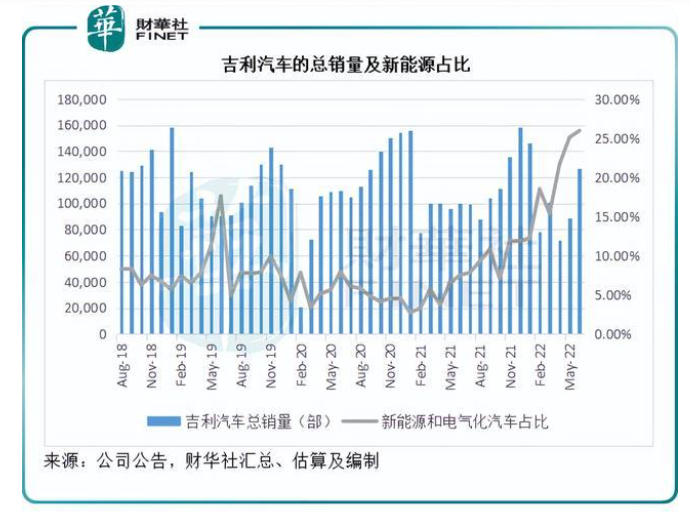 根据吉利汽车的数据,笔者估算,新能源和电气化汽车占其汽车总销量的比重或由2021年6月的7.50%大幅上升至25.94%。