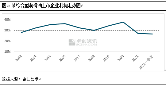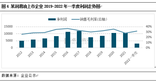 上图为某上市润滑油生产企业公示的净利润及销售毛利率对比,公司主营润滑油产品,在润滑油行业中具有较高的代表性。在主要原材料基础油价格高涨的带动下,2022年上半年润滑油生产企业亦多次发布涨价函,但成本上涨与成品润滑油价格上涨的匹配度不同,润滑油生产企业利润空间收窄。2022年一季度,企业销售毛利率同比下跌17.34%;净利润同比下跌39.3%。