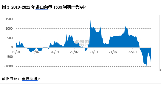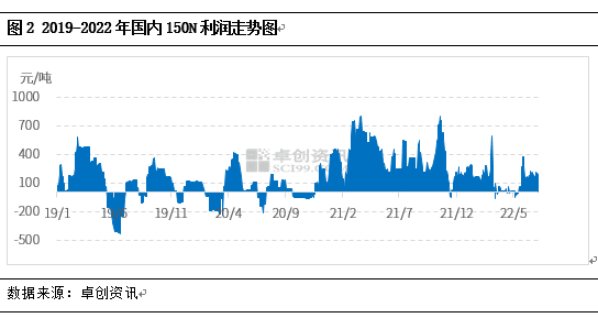 进口基础油:从2019-2022年进口台塑150N利润走势图中我们可以看到,近几年进口资源利润空间变化较大,2021年,利润空间处于三年的高位水平,但到了2022年,进口资源利润长期处于倒挂局面。受原油价格走高及国际炼厂供应紧张等因素支撑,2022年进口基础油成本一路攀升,截至6月底,进口150N理论利润成本在10970元/吨,较去年同期上涨43.52%,理论利润在-770元/吨,同比回落238.37%。2022年上半年,进口150N理论利润均值在136.34元/吨,同比下跌122.72%。