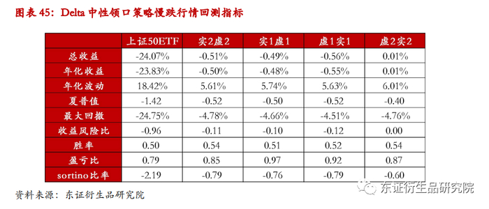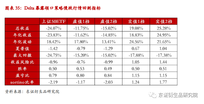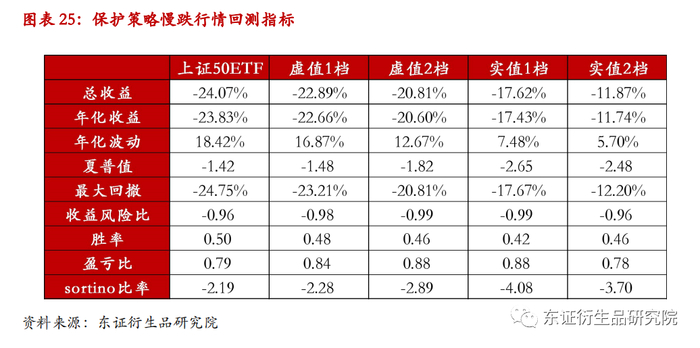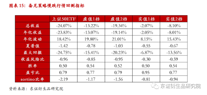 在慢跌行情当中,对冲策略整体收益曲线相较于标的指数更加平滑。总体而言,实值期权的对冲效果好于虚值期权的对冲,若利用实值2档期权进行对冲,可以将最大回撤从原先的-24.75%控制到-12.20%。