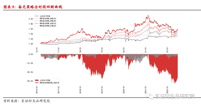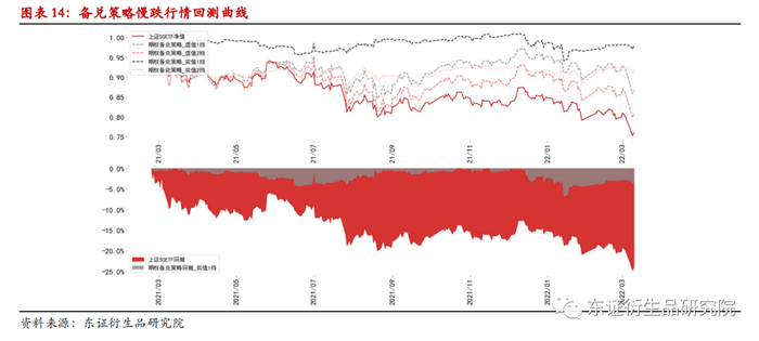 基于备兑策略在不同行情下的对冲表现可以发现,长期来看备兑策略的对冲效果较为不错,可以在减小回撤的基础上保留部分收益。具体到不同行情时,可以发现备兑策略在上涨行情阶段表现不佳,认购期权空头降低了策略 的整体收益;然后在下跌行情中表现不错,兼顾了降低回撤和增强收益两方面的效用。