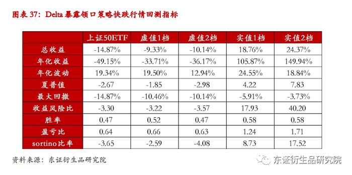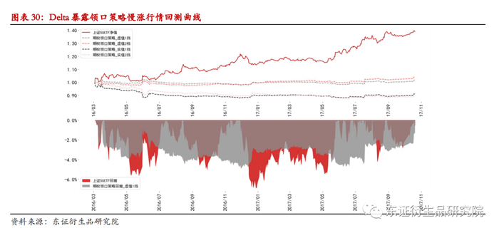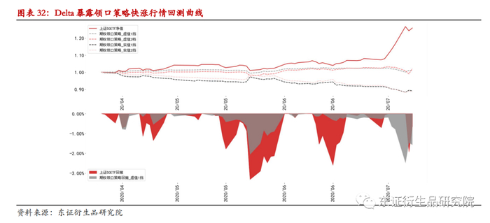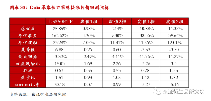 快涨行情中,虚值领口策略保留了少部分的标的上涨收益,而实值领口策略则由于Delta敞口为负,使得整体收益为负。