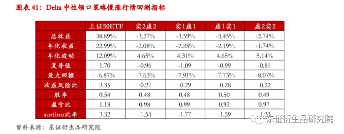 结果显示,构造领口策略时,是否留有一定的Delta敞口对对冲效果的影响较大。长期来看,Delta中性领口策略的对冲效果偏向于股指空头,而当遇到快涨行情时,由于认购期权波动率上升,卖方收益提升,而认沽期权部分不被行权;在快跌行情中,认沽期权多头部分获得较为可观收益。