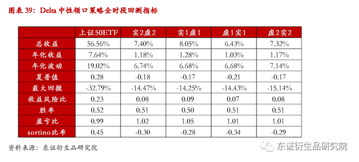 前文提到,若采用相同行权价的认购以及认沽期权构造领口策略,可以使得组合整体的Delta风险敞口为0,这种方式类似于利用股指空头进行对冲。接下来按行权价从低到高分别构造四个不同期权策略组合,分别是实2虚2(实值2档认购期权+虚值2档认沽期权)、实1虚1(实值1档认购期权+虚值1档认沽期权)、虚1实1(虚值1档认购期权+实值1档认沽期权)、虚2实2(虚值2档认购期权+实值2档认沽期权)。下列图表展示了在不同市场行情下Delta中性领口策略的具体表现。分析发现,不同行权价的Delta中性领口策略内部之间的差异并不大,长期来看,年化收益只有0.3%以内的差异,从对回撤的控制来看,不同行权价构建的Delta中性领口策略均能够将标的的回撤有效控制在一定范围内。