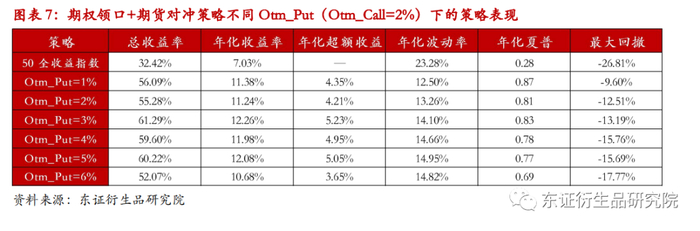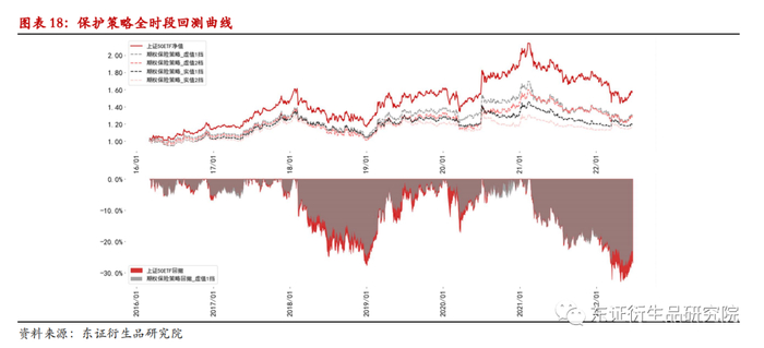全时段回测结果显示,保护期权策略对标的可以起到一定的保护作用,虚值期权相较于实值期权保留更多的收益,但同时对回撤的控制比不上实值期权。