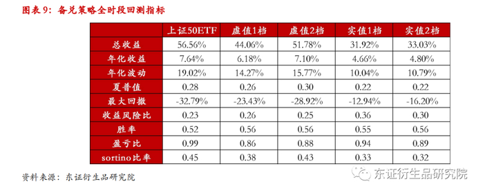 在备兑策略的全时段回测中,考察了四个行权档位的期权合约。总体而言,实值期权的对冲效果要好于虚值期权,以实值1档为例,对冲之后策略整体最大回撤从原始的-32.79%下降到-12.94%,降幅非常明显。在回测时段内,上证50ETF的总收益达到了56.56%,若采用股指期货进行对冲,则将错过这部分收益,若采用备兑策略,继续以实值1档为例,其回测时段内总收益为31.92%,在大幅降低最大回撤的基础上,依然保留了大部分市场上行带来收益。