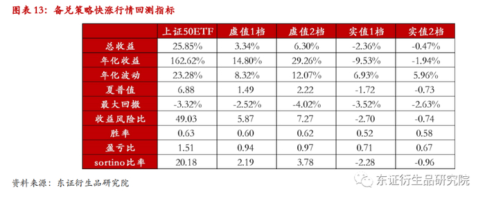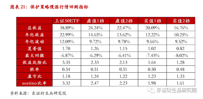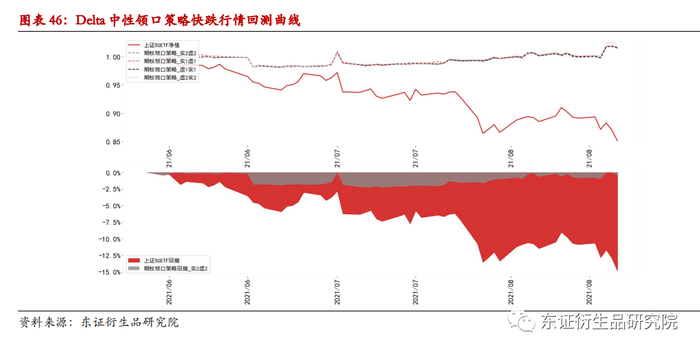 2021年5月至2021年8月,上证50ETF在短时间内经历了较大幅度的下跌,以此时间段作为快跌行情。备兑策略在快跌行情当中效果依然有效,在各档位的回测结果中,实值1档的表现最好。