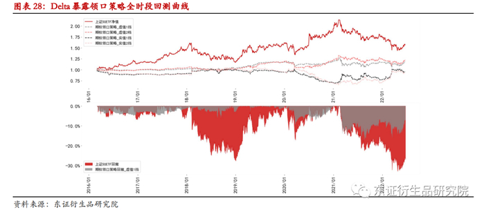 基于上证50ETF期权2016年1月至2022年6月的回测结果显示:备兑策略(实值1档)年化收益为4.66%,最大回撤为-12.94%;保护策略(实值1档)年化收益为2.91%,最大回撤为-23.10%;领口策略-Delta暴露(虚值1档)年化收益为2.77%,最大回撤为-17.10%;领口策略-Delta中性(虚1实1)年化收益为6.43%,最大回撤为-14.43%。