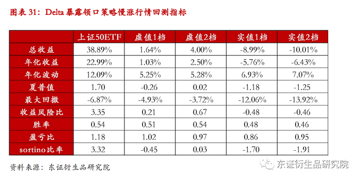 而针对Delta暴露期权策略,由于实值期权的领口策略Delta风险敞口为负,而虚值期权Delta风险敞口为正。所以通过回测曲线可以观察到,在上涨行情中,虚值领口策略的净值上涨,而实值领口策略的净值下跌;在下跌行情中,表现为相反现象。
