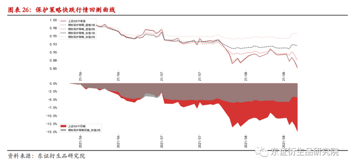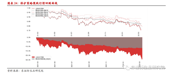保护策略由于持有买入 认沽期权部分的头寸,可以非常有效地对冲市场的下跌行情,尤其是在市场出现尾部风险时效果更加显著。其不足在于持续地持有认沽期权多头需要权利金支出,尤其在市场波动率比较高的时候,这部分权利金的支出是比较可观的。