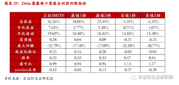 全时段回测结果显示,领口策略的回测表现对期权行权价的依赖很大。虚值期权的对冲效果要好于实值期权。由于本报告中采用相同虚/实值程度认购和认沽期权构造领口策略,故领口策略存在一定的Delta风险敞口,具体而言,实值期权的领口策略Delta风险敞口为负,而虚值期权Delta风险敞口为正。所以通过回测曲线可以观察到,在上涨行情中,虚值领口策略的净值上涨,而实值领口策略的净值下跌;在下跌行情中,此现象同样出现。在构建领口策略的过程中,除了构造留有Delta风险敞口的策略组合之外,还可以利用相同行权价的认购以及认沽期权构造Delta中性的领口策略,其对冲效果近似股指空头。长期来看,上证50ETF上涨时段多于下跌时段,故Delta敞口为正的虚值领口策略表现较好,将原先-32.79%的最大回撤控制在-17%附近,同时保留了部分的指数上涨收益。