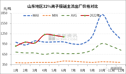根据卓创资讯监测,2022上半年山东地区32%离子碱主流出厂均价1081.78元/吨,较去年同期431.91元/吨大幅上涨150.46%,其它区域涨幅也在100%以上。