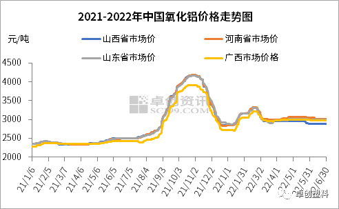 从上图可以看出,2022年上半年中国氧化铝价格较2021年上半年同期价格偏高,持续偏高位运行。以山东市场为例,2022年上半年山东氧化铝均价为3025.77元/吨,较去年同期2397.23元/吨上涨26.22%,涨幅明显。氧化铝价格的持续高位使得氧化铝生产企业对于成本端的控制并不十分严格,对高位烧碱价格接受程度较好。