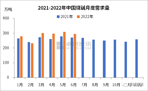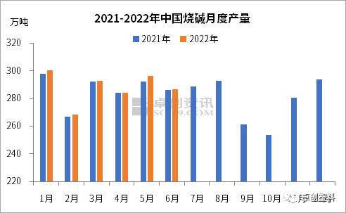 据卓创资讯测算,2022年上半年中国烧碱产量为1729.03万吨,相较去年上半年1720.18万吨增长0.51%,且每月烧碱产量均同比增加。烧碱产量的增加一方面是有新增产能投产,一方面是烧碱价格持续高位运行,多数时间氯碱企业盈利较好,生产积极性高。从具体月份来看,上半年2月因生产时长较短、部分氯碱企业降负荷运行或检修,烧碱产量最低。