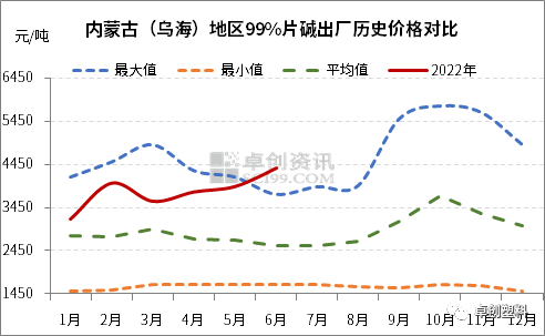 如图所示,上半年内蒙古乌海地区99%片碱出厂月均价均处于历史偏高运行,且随着价格的不断拉涨,在6月份刷新了近5年同期月均价新高,达到上半月均价最高点4365.48元/吨,最低点则出现在1月份,月均价在3192.14元/吨。