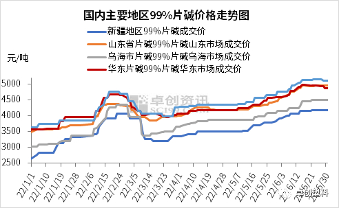 2022年上半年内蒙古地区99%片碱出厂均价达到3813.73元/吨,较去年同期1704.71元/吨上涨123.72%,其它片碱价格涨幅也达到100%以上。