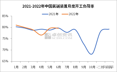 2022年上半年中国氯碱装置平均开工负荷率为79.28%,相较2021年上半年的79.39%下降了0.11个百分点,其中3-4月开工负荷率逐渐下降至低位,与2021年同期走势相反。今年上半年3-4月多地运输效率下降,氯碱企业阶段性出货不佳,且部分氯碱企业春季例行检修,开工负荷率相较去年同期有所下降,液碱供应局部时间偏紧,推动液碱价格进一步上涨。