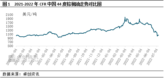 从图中可以看出,自2021年以来棕榈油市场价格走势较为平稳,进入2022年价格波动较为频繁。2022年一季度,棕榈油头号生产国印尼收紧棕榈油出口,支撑价格上行,导致市场价格登上近年最高点。二季度,受到产地供应的影响,棕榈油价格由涨转跌,下降幅度较为明显。目前棕榈油市场在印尼加速出口后失去了前期的主要支撑,同时印尼恢复棕榈油供应,前期供需双弱的态势或转为供过于求,综合来看,短期内,棕榈油市场在基本面利空和宏观面打压下已无挺价动力。
