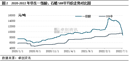 从上图中可以看出,2022年一季度硬脂酸市场在原料支撑下价格水涨船高,国内一级硬脂酸价格高位在15100元/吨,与石蜡价格差在6028.75元/吨;进入二季度硬脂酸市场因原料市场松动,创下近年最大季度跌幅,从3月中旬突破15000元/吨到6月底跌破11000元/吨,硬脂酸市场在二季度将今年一季度的全部涨幅基本回吐完毕。截止到当前,国产一级硬脂酸市场成交在8600-8800元/吨,与石蜡主流型号58半均价9415元/吨相比,价格优势不再。短期内,由于原料端弱势、基本面偏空和宏观面打压,硬脂酸市场或将延续下行趋势。