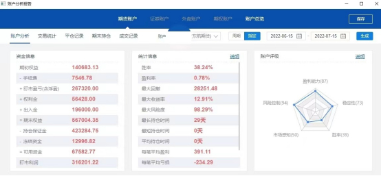 “我参加期货日报实盘大赛整整一个月了,这一个月实际应该是赚了31万元左右,本金使用基本上是30万元。从2018年开始到现在,我的长期胜率都只有38%—40%,但是并不影响这么多年的正向盈利。行情不好的时候,可能几个月权益都是在横盘振荡,横盘振荡期基本上是小亏或者小赚,行情好的时候就能稳步爆发一下,所以没必要过于追求高胜率,同时要敢于拥抱在自己控制范围内的亏损单!”7月16日,昵称为“旗锋”的参赛选手在期货日报赢家在线App期友圈上写道,并配出自己的账户分析报告和净值增长率曲线图。