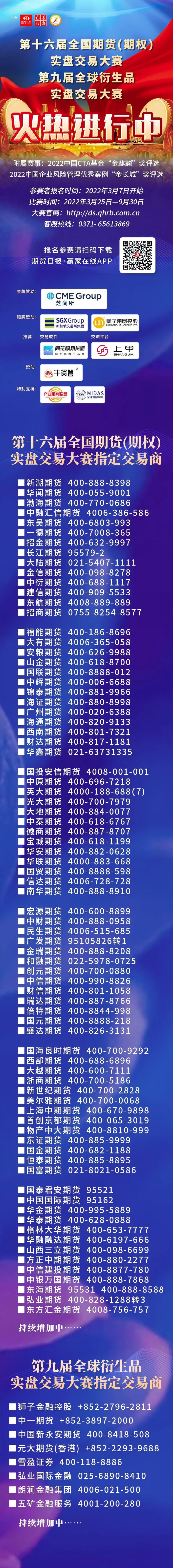 全球赛方面,截至7月12日,在芝商所设置的专项奖中,朗润金融集团的“天空的高度”账户暂居NYMEXWTI期货组第一,“期货侠”账户暂居NYMEXWTI期权组第一,朗润金融集团的“天空的高度”账户暂居微型E—迷你纳斯达克100指数期货组第一,“FPlus”账户暂居微型E—迷你纳斯达克100指数期货期权季度合约组第一,中一期货的“yee818”账户暂居COMEX黄金期货组第一,“朔阳小将”账户暂居COMEX黄金期权组第一,中国新永安期货的“飞飞静静飞”账户暂居CBOT大豆期货组第一,“shikari”账户暂居CBOT大豆期权组第一,朗润金融集团的“天空的高度”账户暂居10年期美国国债期货组第一,“shikari”账户暂居10年期美国国债期权组第一,朗润金融集团的“天空的高度”账户暂居欧元/美元期货组第一,“朔阳小将”账户暂居欧元/美元期权组第一。