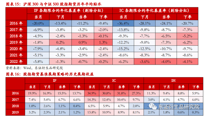 与空头不同,持有股指期货多头可以获得可观的展期收益,在选择合适的合约与合适的展期时点的情况下,IC历年来的多头展期收益可以达到10%。近年来深贴水的情况虽然有所缓解,但是场外业务的多头持仓需求加剧了股指期货不同期限合约的多空博弈程度,中证1000上市后,可选择标的增加至8个合约,不同期限合约上的多空博弈力量分布将变得更为分散和复杂,也意味着新的交易机会。