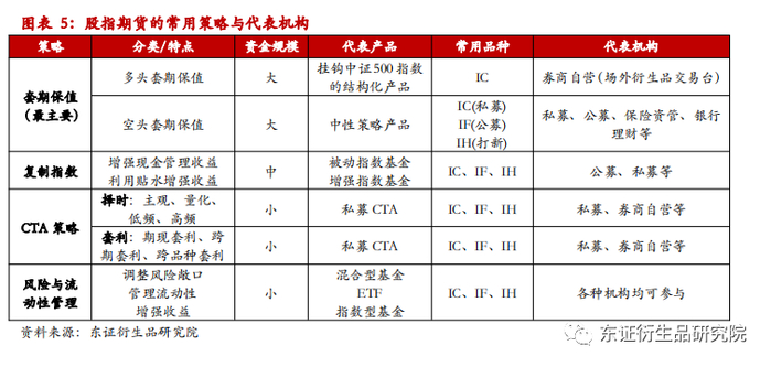 中证1000指数与中证500指数有着较高的相关性,2005年来指数收益率的Pearson相关系数高达0.9以上,因此中证1000股指期货一方面作为中证500股指期货的相似替代品,会分流一部分中证500股指期货上的存量资金,另一方面作为最能代表小盘股特征的衍生品,有着更高的波动率和弹性,同时提高了投资者对中证1000品种的关注度,有望吸引增量资金的入场。考虑到中证1000与中证500股指期货的相似性,中证1000的策略运用预计与中证500股指期货相似,最大资金规模的需求将来自中性策略的空头对冲需求与结构化产品的多头对冲需求,另外可用于多头替代收益增强、跨期与跨品种套利、CTA策略、风险与流动性管理等。