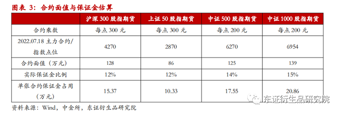 相比征求意见稿,正式规则明确了中证1000股指期货合约交易保证金为15%,略高于中证500股指期货合约的14%保证金比例;交易结算相关手续费率及交易持仓限额与中证500股指期货一致。按照7月18日收盘价估计,中证1000股指期货合约面值约为139万元左右,单张合约保证金占用约20万,是四个股指期货品种中合约面值最大的品种。