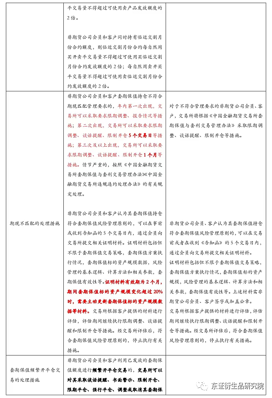 第三,关于期现不匹配、频繁开平仓的监管处罚措施做出了更加细致的规定,并进一步明确了提交证明材料的流程。非期货公司会员和客户套期保值持仓不符合期现匹配管理要求的,年内第一次出现,交易所可以采取要求限期调整、报告情况等措施;第二次出现,交易所可以采取要求限期调整、谈话提醒、限制开仓5个交易日等措施;第三次及以上出现,交易所可以采取要求限期调整、谈话提醒、限制开仓1个月等措施。