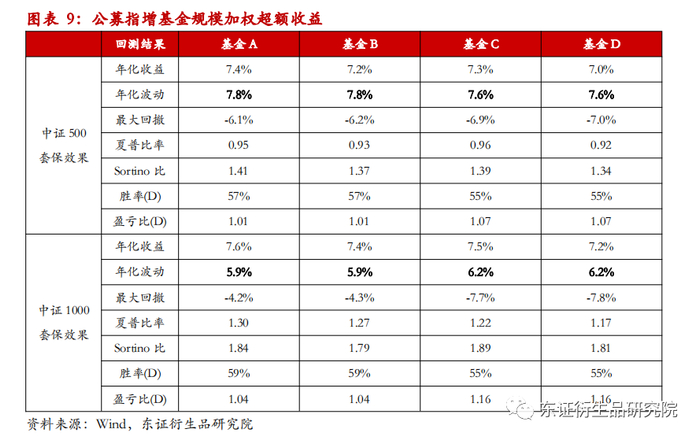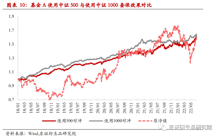 但是我们注意到中证500与中证1000指数的相关性非常高,同样作为对冲工具,两个品种具有很强的相互替代性。我们以某公募中证1000指数增强基金作为套保标的,对比之间做空中证500指数与做空中证1000指数的套保效果。