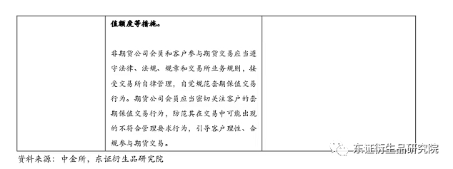 第二,关于套期保值额度频繁交易做出了明确说明:套期保值交易每自然周买开卖平交易量不得超过可使用买产品发放额度的2倍;每自然周卖开买平交易量不得超过可使用卖产品发放额度的2倍。过去亦有此限制,在《中金所套期保值与套利业务指南》中有规定,本次在套期保值管理办法做出了更加明确的规定和说明。