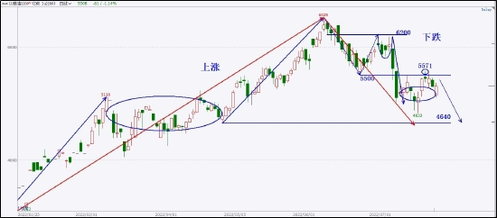 低硫燃料油在经历前一轮上涨之后,完成了上涨三段结构,最终在6528处开始拐头向下。价格向下并没有太过踟蹰,从5500的反弹在6200处形成局部双顶,然后强势破位下跌,形成N型下跌结构,后市空头情绪将影响较长时间。
