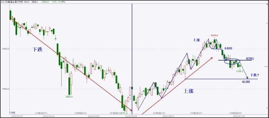 目前股指跌过局部双顶颈线4400,展开连续的折返下跌攻势,目前价格在4285附近多空争夺,进入震荡中继状态,后市延续下跌的可能性越来越大。可以在小周期上寻找做空机会,跟随市场下行。下方需要关注4100支撑。
