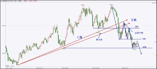 原油的支撑是很明显的,600元一桶是重要的市场心理关口。前期受俄乌战争对国际原油供给的影响,使得价格一路上涨至740元一桶,在俄乌战争持续影响的前提下,价格想要再次回到600元以下,是得不到市场认可的。因此,如果价格后市测试600元附近的支撑区,将是非常合适的买入机会。