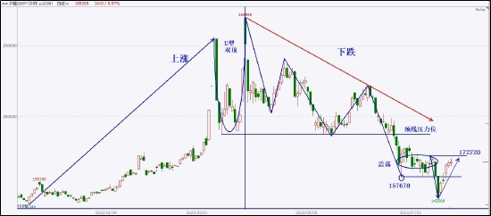 沪镍已经是多次进入市场涨跌幅前三的品种。暴涨暴跌,波动较大,操作时注意资金风险。具体走势上看,沪镍在前期一轮上涨波段之后,实现了一个U型的双顶转换,然后从测试270000失败后,开始震荡徘徊下跌。经过反复折返之后,价格的重心持续下移,并强势突破双顶颈线186370。目前价格经过一个震荡中继和二次释放之后,便转头上涨,进入反弹阶段。