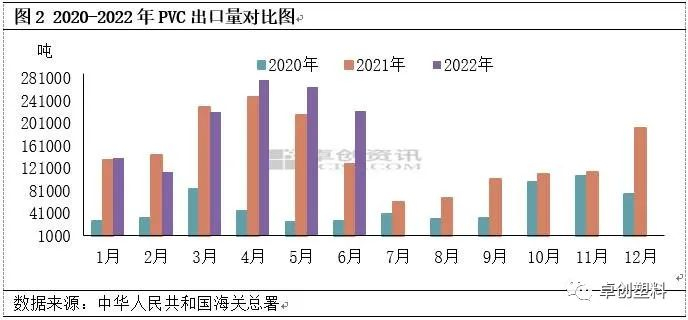 上半年中国PVC出口量相比2021年同期进一步增多,有力弥补了国内需求的不足。2022年上半年中国PVC粉出口量为124.23万吨,对比2021年同期的110.22万吨增加了14.01万吨,增幅为12.71%。上半年出口量增加,主要是因为一方面2022年2月末开始,原油价格大幅上涨,欧美PVC粉成本大幅攀升,部分欧洲国家货源紧缺,中国出口到欧洲部分国家的货源同比有所增多;另一方面,2022年2月印度对中国的PVC粉反倾销政策正式到期,中国出口至印度的PVC粉数量明显增多,上半年PVC粉出口至印度的总量为37.9万吨,同比2021年上半年增加15万吨。