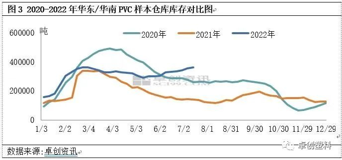 PVC社会库存今年居高不下,二季度不降反增。PVC社会库存有一定季节性规律,一般一季度处于累库阶段,但二季度是PVC传统旺季,因为PVC集中检修叠加需求恢复,二季度PVC社会库存会不断去库,但今年二季度社会库存降幅十分缓慢,5-6月份不降反升,这主要是需求超预期转弱,短期国内PVC市场供大于求导致。