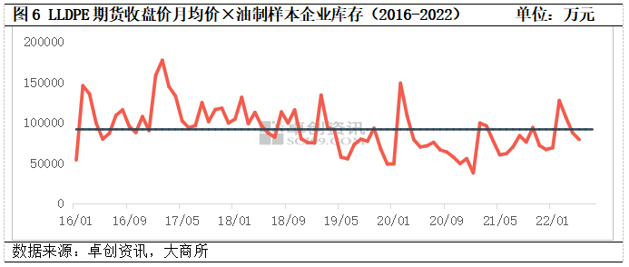 LLDPE选取LLDPE选取主力期货合约月均收盘价与油制样本企业库存相乘(见下图),量价平衡逻辑也较为显著:均值91742万元,标准差28489万元,离线系数0.3105。从图中我们可以看到2016-2019年量价乘积重心偏高,而2020-2022,量价重心明显偏向下移,这与中国大炼化装置集中上马有关,新产能改变供应的成本边际,使得量价乘积下移。目前由于下游需求仍较为低迷,其量价乘积明显低于平均水平。随着6月份社零数据的同比转正,预计下半年量价乘积将适当向上修复。