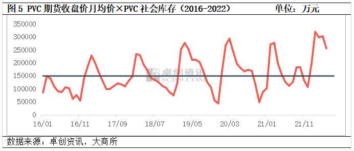 PVC选取的PVC主力期货月均收盘价与PVC社会库存相乘(见下图),可以看到量价平衡同样存在(具备明显的周期性),其均值148844万元,标准差61522万元,离散系数为0.41,PVC价格的波动收到供需平衡影响明显弱一些,市场在定价过程中,受到成本端的定价影响更明显一些,从时间轴上看,呈现波动放大的状态,目前量价乘积显著超过平均线,在全球流动性收紧的和中国房住不炒的现状下,下游房地产需求难有乐观改善,下半年将逐步回归或回复至正常水平