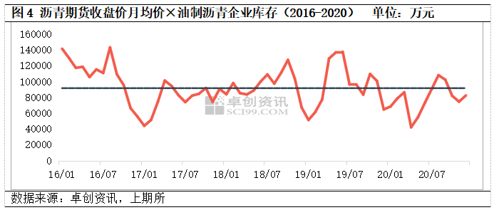 沥青选取的是2016-2020 沥青主力月均收盘价与沥青炼厂库存相乘(见下图),可以看到量价平衡同样符合理论假设,其均值为91638万元,标准差为24275万元,离线系数0.2649,说明量价乘积离散度较小,但比原油大。2020年初量价乘积在均线下方,说明沥青存在估值偏低的情况,这与2020年上半年受疫情影响,重要项目的实际施工进程受影响。