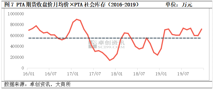 PTA选取PTA主力期货合约月均收盘价与PTA月度社会库存相乘(见下图),由于PTA在2019年后产能大幅扩增,供过于求下社会库存显著上升,因此数据上只能选择2016-2019年数据,其反映PTA的量价关系仅作定性分析:均值550506万元,标准差190550万元,离散系数0.3461,这说明PTA量价关系要显著弱于其他品种(考虑到时间较短),而在供应过剩的情况下,量增价减的趋势仍在持续,盈利空间压缩,PTA更容易受到上游成本的驱动。