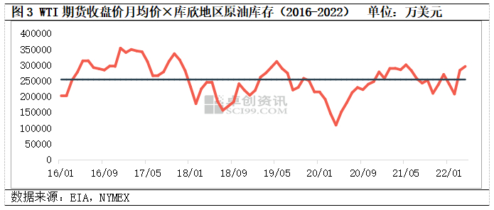 原油选取的是2016-2022 WTI主力月均收盘价与库欣地区库存相乘(见下图)。可以看到量价平衡基本符合均衡理论的假设。其均值254064万美元,一个标准差为28489万美元,离散系数为0.2076,说明量价乘积离散度较小,说明原油量价关系明显。目前原油量价乘积位于五年均线上方,说明其估值存在金融溢价成分。但从目前全球能源危机的情况来看,这个溢价并不明显,原油仍存在被低估的情况,这也与油价波动率上升,期货市场资金持续净流出有关。