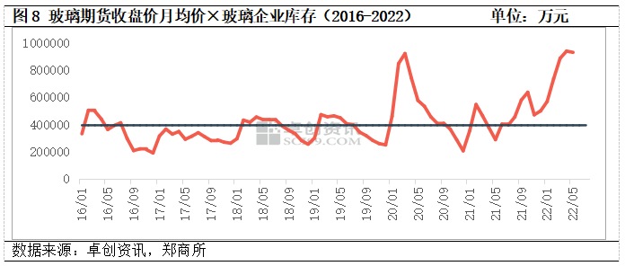 玻璃选取玻璃主力期货合约月均收盘价与玻璃企业库存相乘(见下图),量价平衡逻辑也基本适用:均值394085万元,标准差135245万元,离散系数0.34。虽然玻璃仍符合量价逻辑,但可以看到玻璃量价乘积极值显著离群(大幅超过平均水平),这与玻璃上游受到能源影响和环保政策有关,玻璃对连续生产的要求较高,阶段性的双重压力就会使得玻璃的量价乘积阶段性的大幅超过平均水平。2021年下半年以来因为能源的大幅上涨,导致纯碱和能源价格显著偏离正常水平,这就对下游的玻璃产生了类似戴维斯双击效应,但从长期来看,房地产作为浮法玻璃的主要下游,在开发投资处于下行趋势中,占比6.5%的安装投资也难有逆转趋势,预计下半年玻璃估值将继续下移。