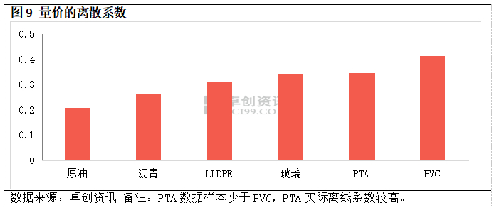离散系数:量价乘积的标准差与均值的比,根据一般均衡理论可以看做供需平衡边际变化与价格变化之间的关系。理论情况下,假设某个商品完全受到供需量主导,则量价乘积为一个常量,而波动幅度越大,就说明均衡的量价受到成本边际和需求边际的影响,甚至单纯货币政策的直接金融属性(投机)的传导。而通过对比,我们发现原油的离散系数最小,说明原油定价中的商品属性主导要高于下游的大宗商品。
