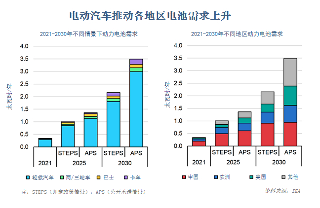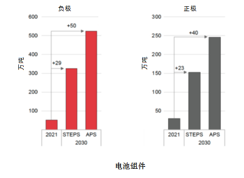 预测的2020年代末矿产供应量与IEA关于世界能源模型“既定政策情景”(STEPS,StatedPoliciesScenario)下的动力电池需求量一致。但是一些矿产比如锂的供应量到2030年需要增长1/3才能满足同一能源模型中“公开承诺情景”(APS,AnnouncedPledgesScenarion)下动力电池的需求。
