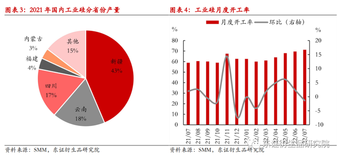 四川地区是工业硅主产地之一,2021年产量占到全国产量的16.8%,此次限电停产对国内工业硅供给将带来一定影响,影响大小主要取决于停产范围及时长。我国四川地区工业硅产量主要来自雅安、凉山、乐山、阿坝地区,攀枝花等地有零星分布。据SMM消息,目前雅安、乐山及阿坝地区硅企已全部全天候停产,凉山地区硅企处于降负荷生产状态。后续政策是否完全严格执行,即企业是否全部24小时停产,仍待观察。此次限电停产出于高温少雨条件下保障居民用电的目的,但长时间停产会对工业硅冶炼炉产生一定影响。若8月20日能够按时复产,则多数冶炼炉可在供电恢复后快速恢复生产,但也有少量炉子还需重新挖炉再复产。假如一周后四川高温少雨缺电情况延续,限电政策结束日期未定,对产量影响或将扩大,仍需继续观察。假设四川硅企均严格遵守24小时停产的规定,结合今年7月份四川地区产量及开工率情况,预计本周停产将造成约1.4万吨的产量损失。